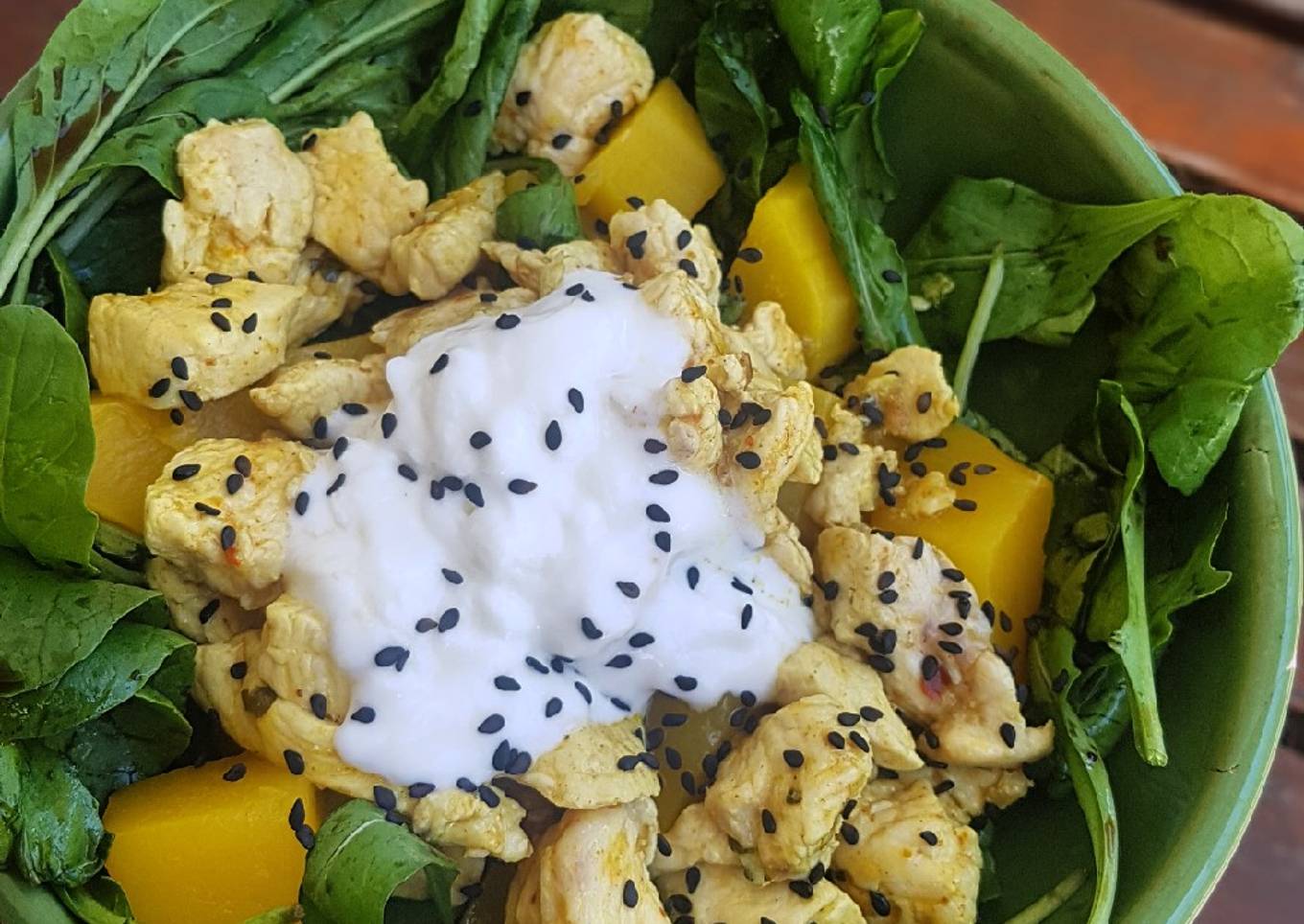 - Para ensamblar, primero condimentas la rúcula con aceto, por sobre ella colocas la calabaza, luego el pollo, coronas con yogur natural (podes decorar con sésamo negro, que suma 10 puntos!).