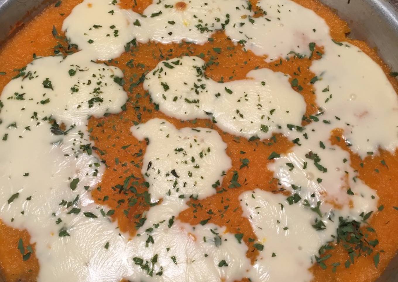 - En una fuente colocar una base de puré de calabaza, agregar la carne y otra capa de puré de calabaza